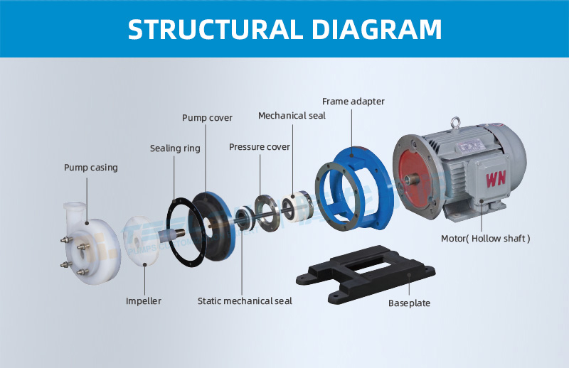 IHF-L fluoroplastics centrifugal pump, according to international standards, overcurrent components are all fluorine plastics, load-bearing parts are metal materials, equipped with external bellows mechanical seals, grinding materials are alumina, silicon carbide, fluoroplastics, cemented carbide, It can be selected according to different working conditions.