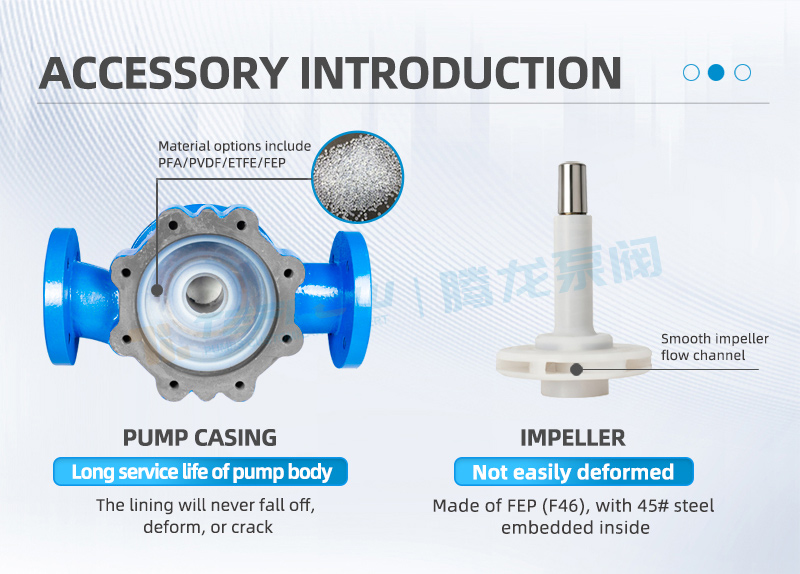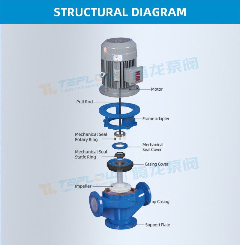 IHF fluoroplastic centrifugal pump, the flow-through parts are made of acid resistant PTFE,FEP,PFA,PVDF and other plastic materials. it is an ideal choice for industrial corrosion resistance. it has mechanical seals and couplings and is driven by motors.