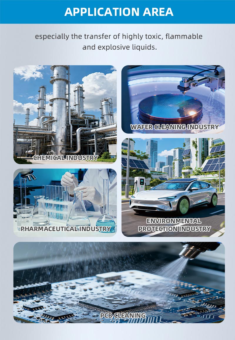TMF-G high temperature PFA lining magnetic pump, made of imported PFA lining material, can transport a variety of acids, bases and highly corrosive organic solvents between 100℃ and 150℃, which is an ideal solution for fine chemical industry.